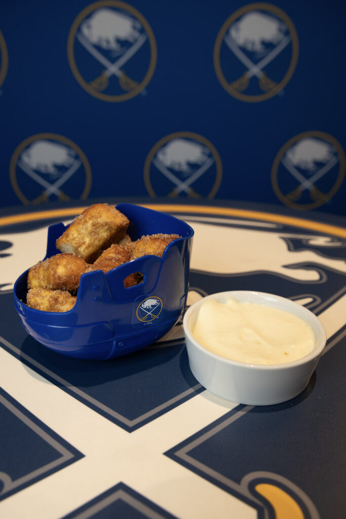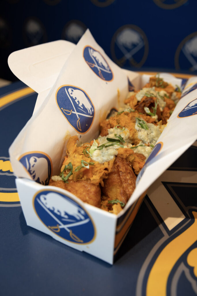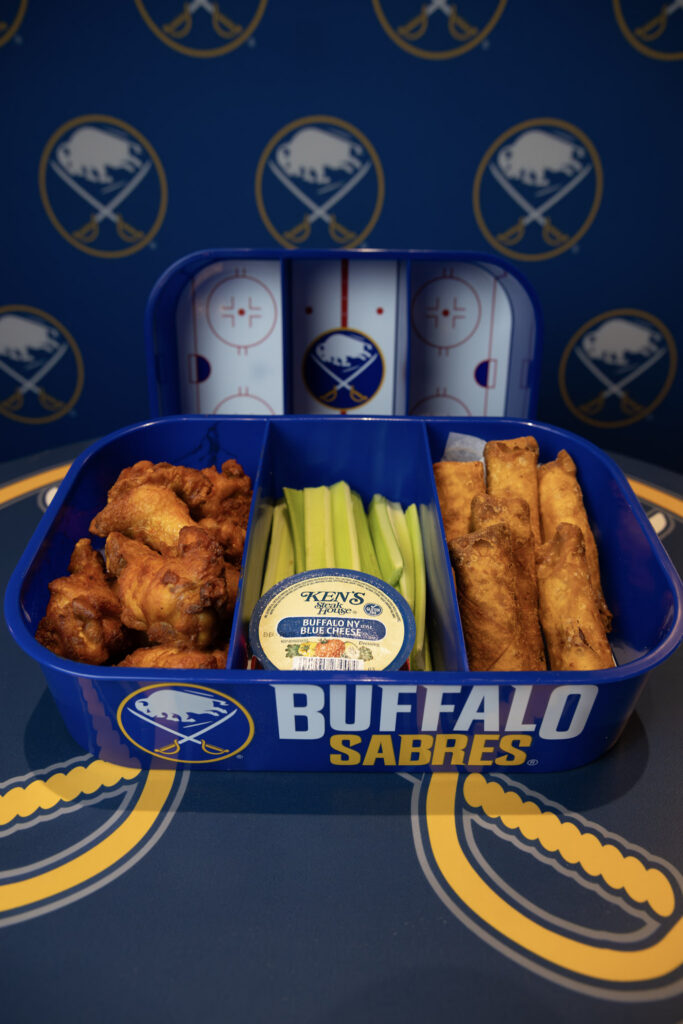 - Let’s Go Buffalo Wings & Pizza Logs: Served in a souvenir Sabres ice rink tray! 10 Buffalo-style chicken wings, 8 pizza logs, served with blue cheese, marinara and celery sticks. Available at 100 level Blue Line Fryer.