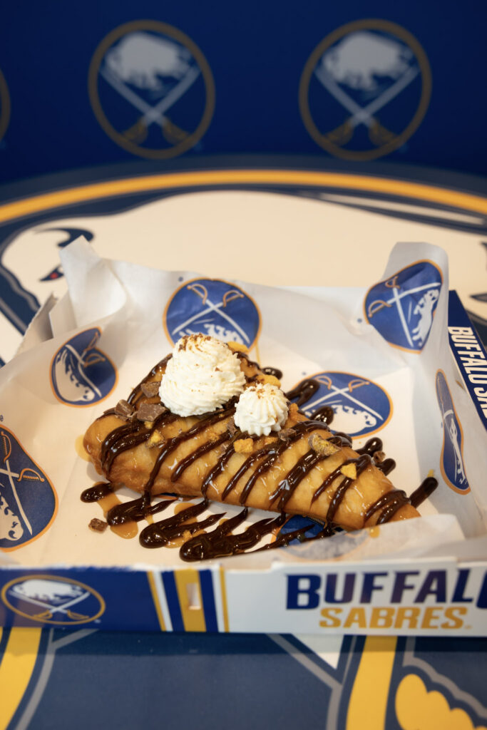- Sponge Candy Crunch Fried Dough: Fried dough, hot fudge, warm caramel, crushed sponge candy. Available at Let’s Dough Buffalo stands.