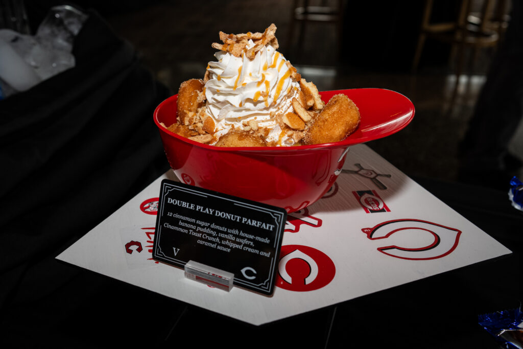 Available at Section 413. - Double Play Donut Parfait – Cinnamon sugar donuts layered with house‑made banana pudding, vanilla wafers, Cinnamon Toast Crunch cereal, whipped cream and caramel sauce.