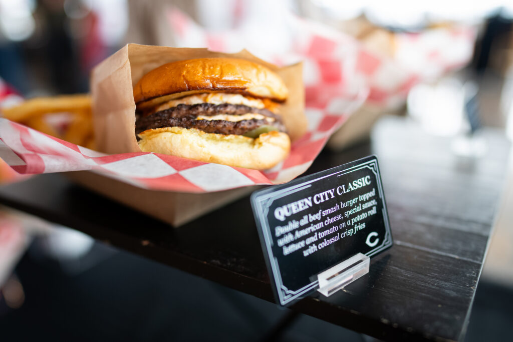 Available at Section 130. - Queen City Crunch – Double all‑beef smash burger topped with pimento cheese, crushed Grippo chips and pickles on a potato roll, served with colossal crisp fries.