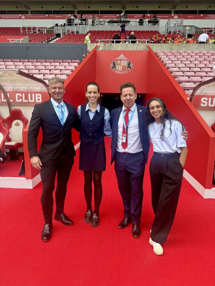 Above: Delaware North U.K. and Sunderland AFC hosted a preseason tour of the Stadium of Light to show off enhancements to the concourse. Pictured at center (left to right) are Nik Chapham, head of events for Sunderland AFC; Zoe Hadaway, head of people for Delaware North at London Stadium; Marco Galer-Reick, vice president for Delaware North U.K. strategy enablement and HR; and Tal Bar Yoseph, head of customer success for Ubeya, Delaware North U.K. technology partner.