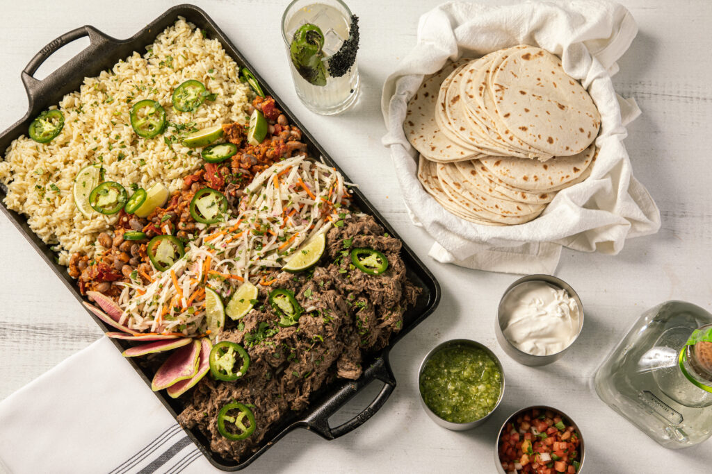 - Taquiera Taco – Braised beef, lime rice, cowboy beans, guajillo pepper, jimaca slaw, salsa verde in flour tortillas with sour cream and pico de gallo.