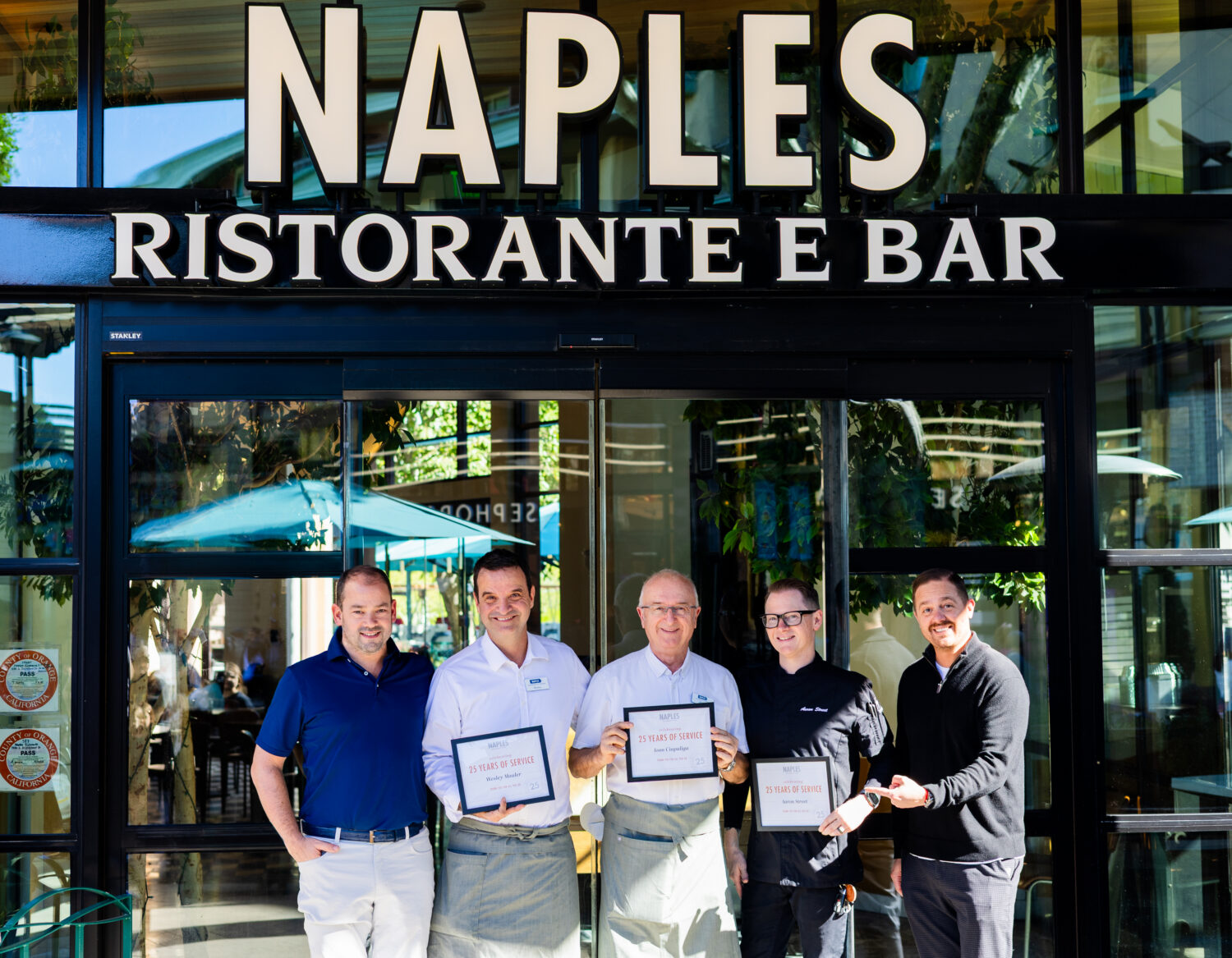 Patina Group’s Italian restaurant in Downtown Disney, Naples Ristorante E Bar, is celebrating its 25th anniversary in 2026. Last month, three team members who have been part of the Naples story since Day One were recognized by Delaware North and Patina Group leadership. Pictured from left to right are Jamie Obletz, Delaware North executive vice president and chief operating officer; Wesley Mauler, server; Ioan Ciupuliga, server; Aaron Street, expo; and John (JK) Kolaski, president of Patina Group.