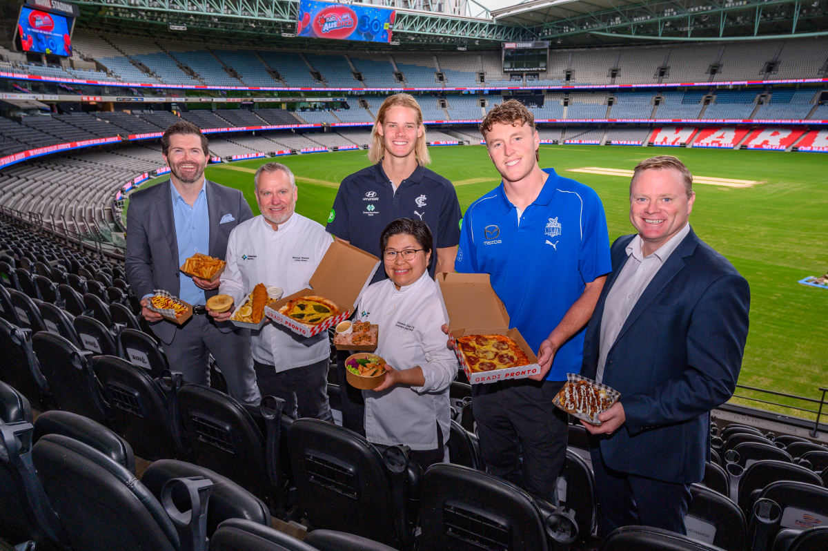 Main caption: Pictured after the announcement of Delaware North’s contract extension at Marvel Stadium in Melbourne (left to right) are Scott Fitzgerald, Australian Football League (AFL) general manager, Marvel Stadium; Markus Werner, culinary director, Delaware North Australia and New Zealand; Tom De Koning, Carlton Blues player (AFL); Princess Anne Uy, executive sous chef at Marvel Stadium; Nick Larkey, North Melbourne Kangaroos player (AFL); and Kieran Fitzpatrick, chief operating officer for Delaware North Australia and New Zealand.