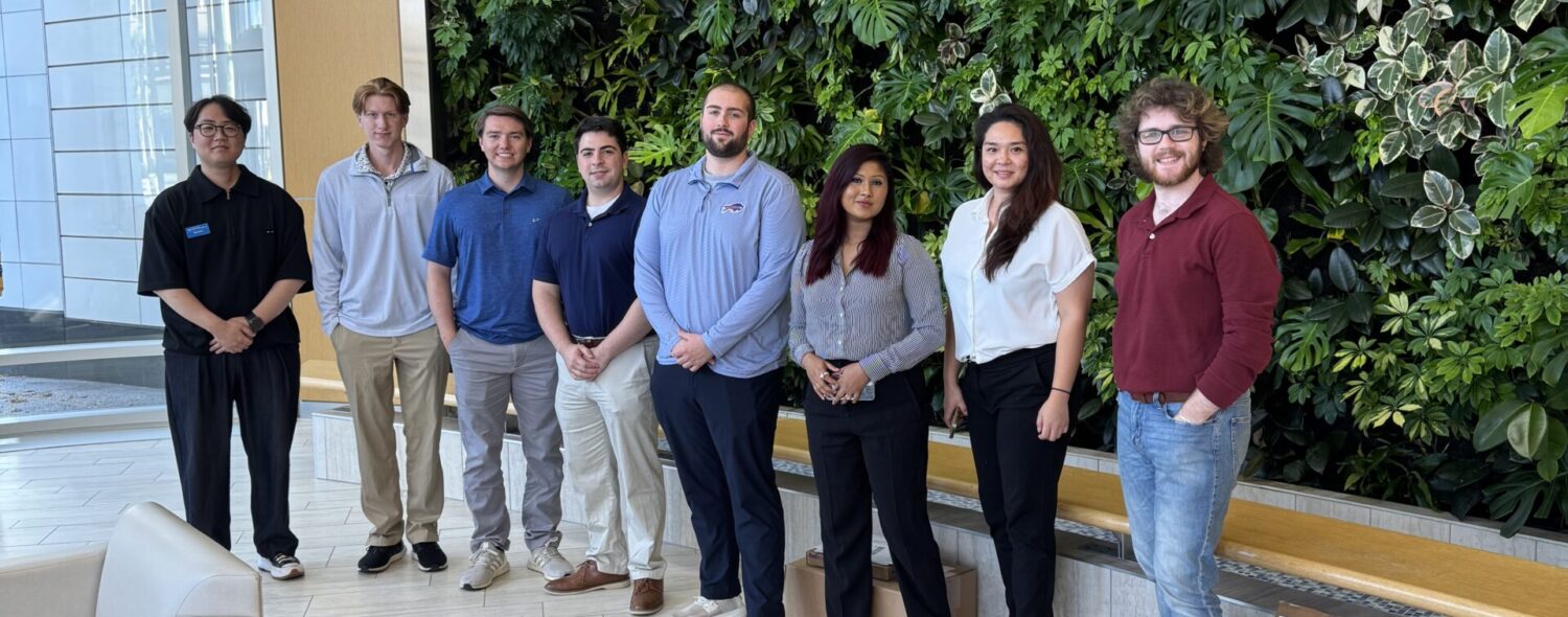 Main caption: Delaware North hosted University at Buffalo MBA students on Sept. 26 for a site visit through the business school’s Corporate Champion program. Pictured (left to right) are students Ethan Choi; Matthew Eiss; Zachary Barney; Jake Chiaino; Brandon Pettit, accounting analyst; Fariya Bushra; Helen Chiang; and Matt Blidy, accounting analyst.