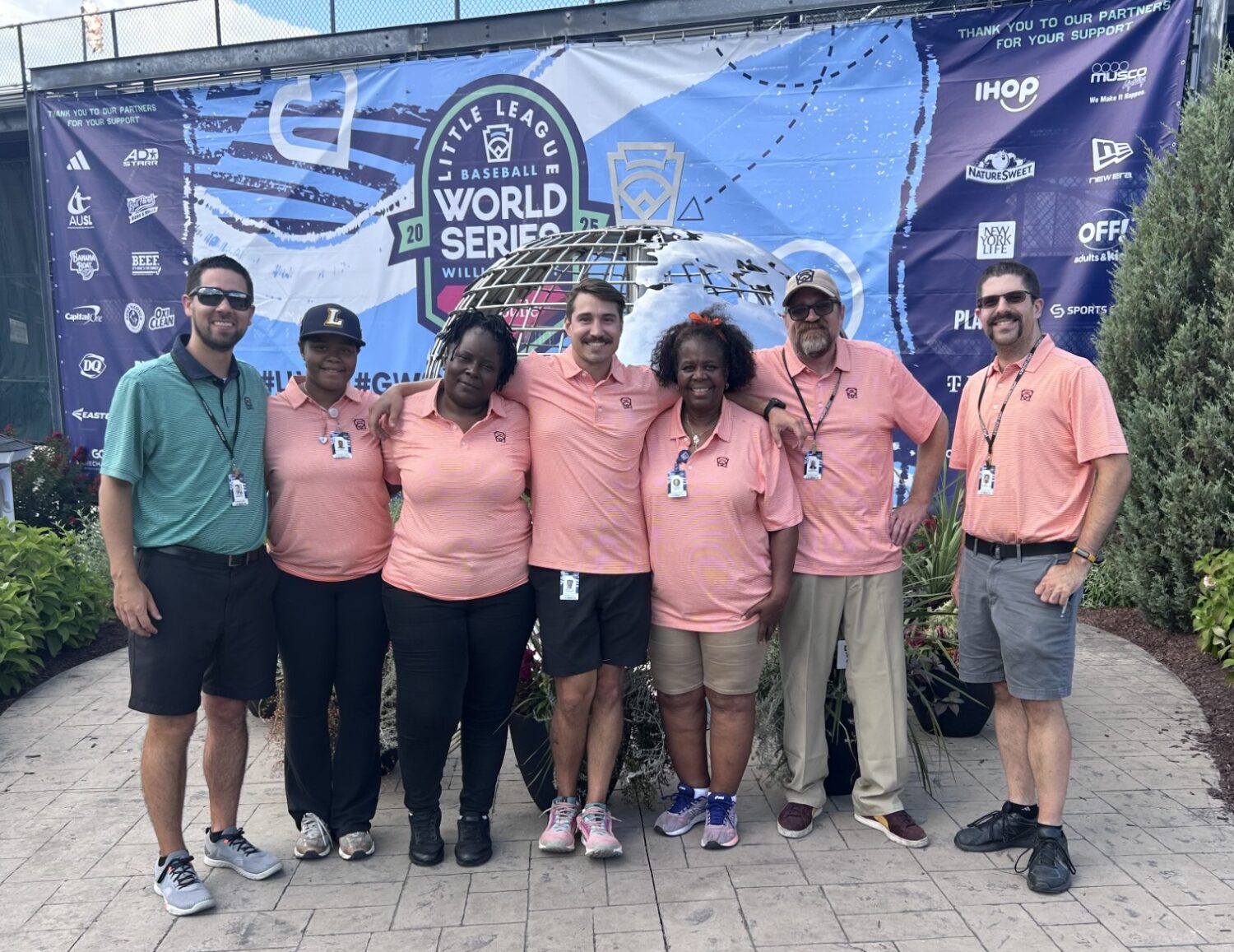 Main caption: Team members from several Delaware North Sportservice operations come to Williamsport, Pa., every August to support the company’s operation of food and beverage and retail services for the Little League World Series. From left to right are Tony Niemeyer, accounting; Jada Edwards-Patterson, culinary supervisor at Little Caesars Arena; Reva Hairston, culinary supervisor at Little Caesars Arena; Nick Hanneken, general manager for the event and concessions manager at Great American Ball Park; Laureen Beach, assistant concessions manager at Great American Ball Park; Adam de Quattro, category management coordinator; and Eric Drumheller, IT analyst.