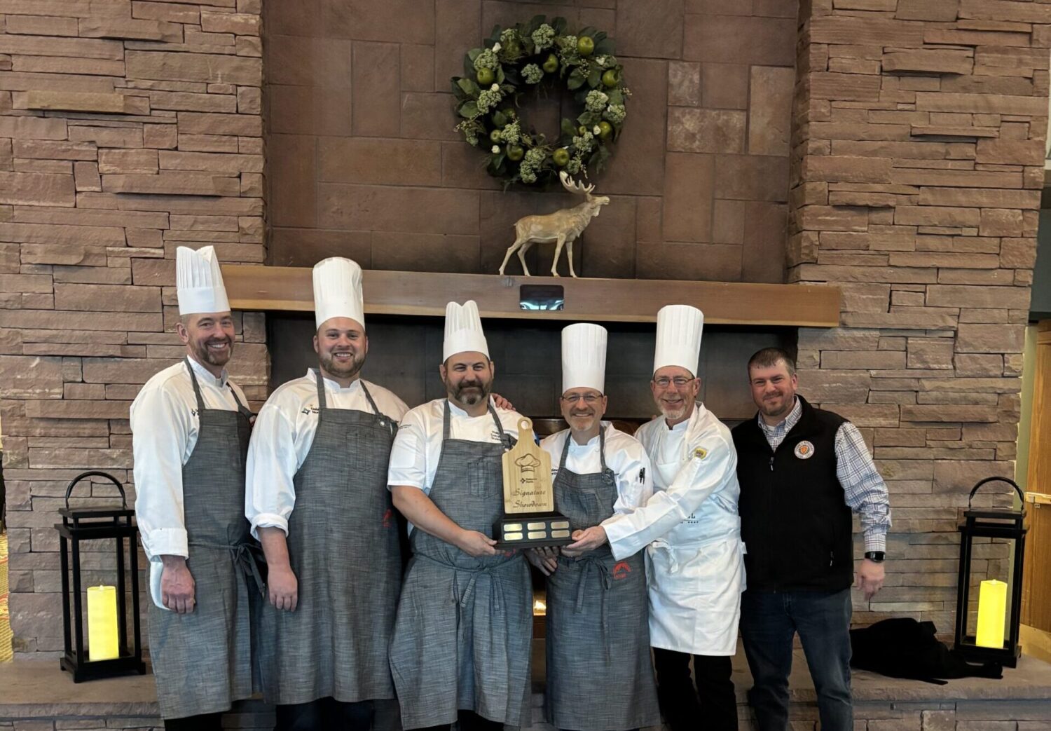 Main caption: Delaware North Parks and Resorts general managers (GMs) participated in a “Signature Showdown” competition during the recent 2025 Parks and Resorts GM Meeting at the Holiday Inn Estes Park in Colorado. Members of the winning team pose with the Signature Showdown Cutting Board Trophy following the event. Pictured from left to right are Jon Wilson, director of culinary for Parks and Resorts; Tyson Budler, GM at the Holiday Inn West Yellowstone; Phil Musch, executive chef at Shenandoah National Park; Wayne Soard, GM at Courtyard Titusville Kennedy Space Center; Michael Barnes, GM at Niagara Falls State Park; and Brian Sterner, vice president of food and beverage operations for Parks and Resorts.