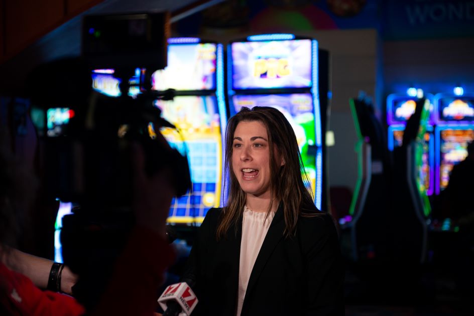 Above: Wheeling Island President and General Manager Kim Florence, pictured at left, spoke on March 5 during the grand opening ceremony of the property’s new Light & Wonder Lounge, which included a formal ribbon cutting.